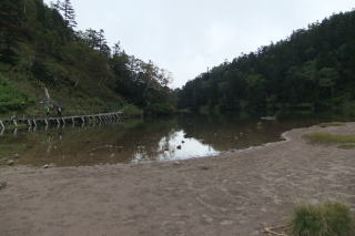 鹿よけのゲートを抜けて、コメツガが茂る林の中を歩いて行った。 |